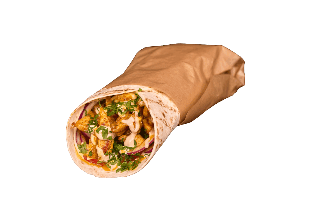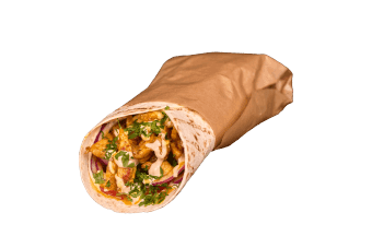 Tortilla, pulpă de pui. humus, tahini, sos mango,