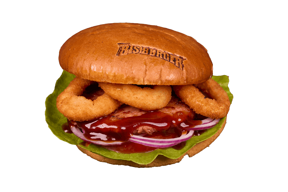 Carne vegană, dulceață ardei iute, salată, roșii, ceapă, inele de ceapă, sos bbq