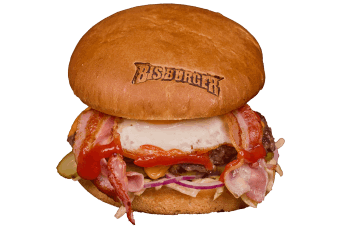 Carne vită, salată iceberg, maioneză, ketchup, usturoi, tabasco afumat, ceapă, brânză cheddar,castraveți murați, bacon, ou ochi